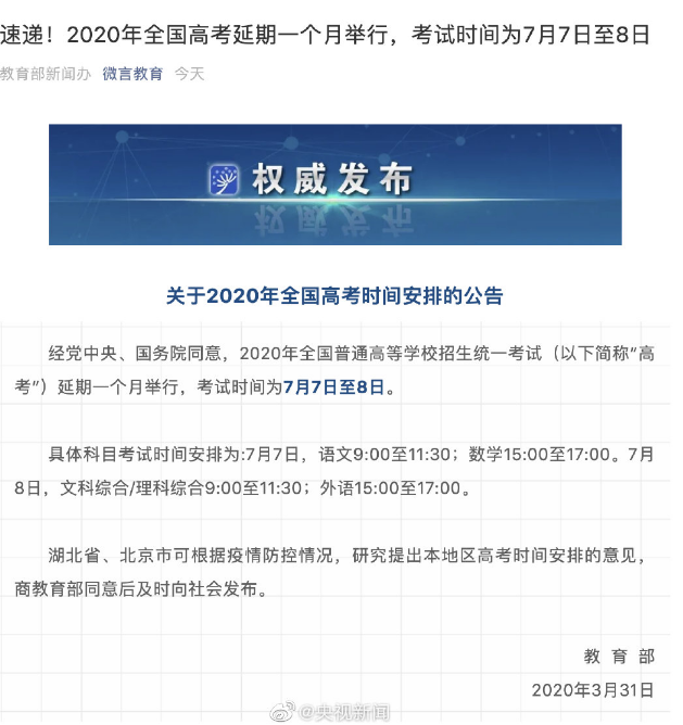 经党中央、国务院同意,2020年全国普通高等学校招生统一考试延期一个月举行,考试时间为7月7日至8日。具体科目考试时间安排为:7月7日,语文9:00至11:30;数学15:00至17:00。7月8日,文科综合/理科综合9:00至11:30;外语15:00至17:00。湖北省、北京市可根据疫情防控情况,研究提出本地区高考时间安排的意见,商教育部同意后及时向社会发布。