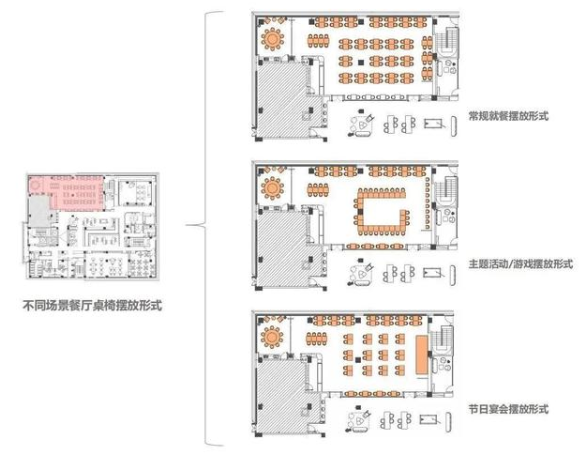 在疫情期间,作为一个人口密集的公共场所,餐厅应该关闭或改造。对于不能在室内就餐的情况,在室内就餐时应合理控制桌椅空间,可分可合,灵活多变,必要时可单独用餐。