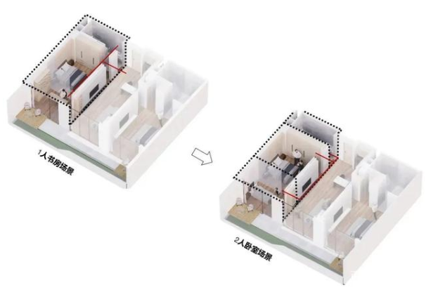 居室空间非单人居室时,疫情期间同居室老年人间具备相互隔离的条件。产品设计时建议预留一定的转换弹性。