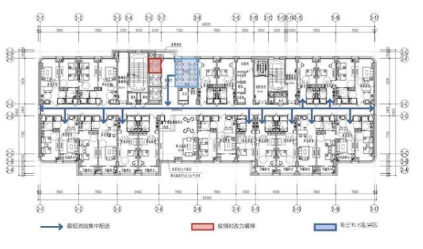 疫情期间尽量减少居民聚集活动,集中用餐方式改为集中配餐。除加强社区管理和人员安排外,建筑的流线型组织应具有一定的灵活性。例如,在特殊情况下,电梯可作为餐饮电梯,直接到达各楼层的餐饮区,并通过公共走廊直接到达各住户。公共走廊应设置通风消毒系统。