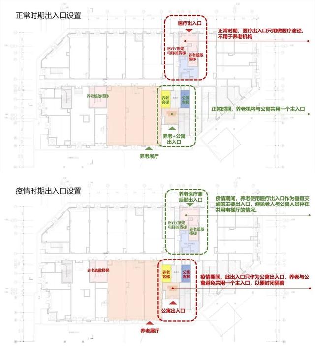 许多养老项目形式复杂,往往与商业、居住等其他形式相结合。在出入口设计上,养老机构应建立独立的出入口机制,有效分离,这对疫情防控起着关键作用。