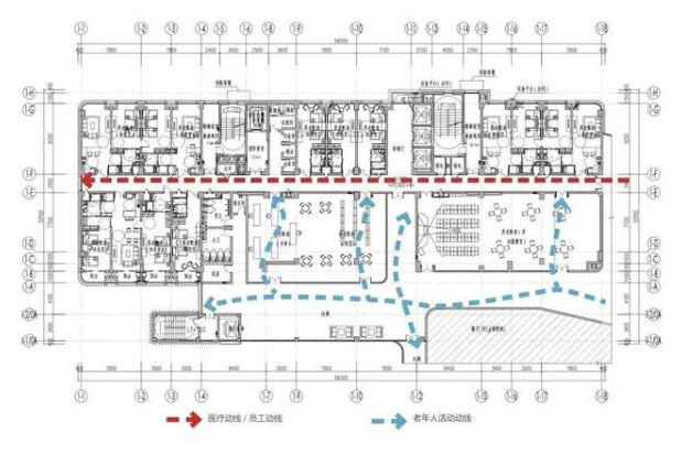 在组织养老单位的流线时,要尽量将医疗动线和职工动线与老年人动线分开。医务人员在工作时,应尽量减少老年人活动的公共区域通行次数。