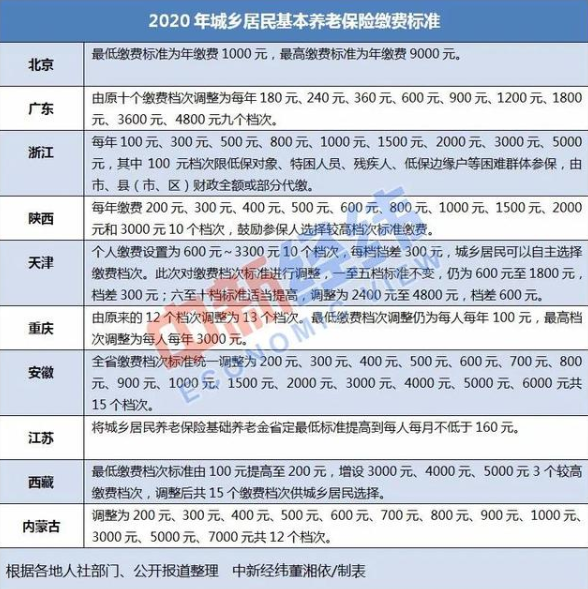 据不完全统计,从2020年1月1日起,北京、广东、浙江、陕西、天津、重庆、安徽、江苏、西藏、内蒙古等省区市,已实施新修订的城乡居民基本养老保险实施方案,多地调整了个人缴费档次标准,提高了缴费上限。