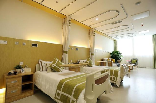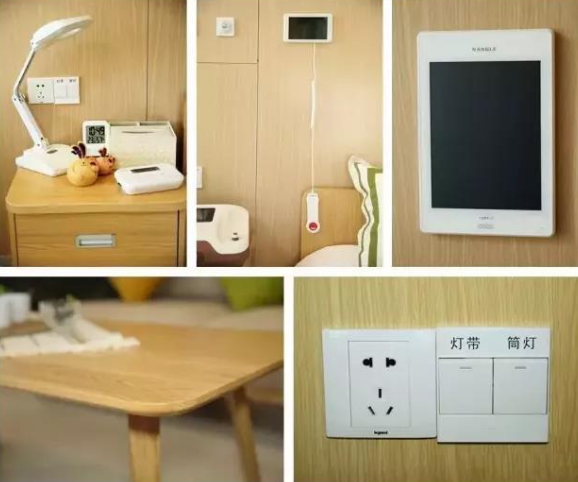 老年患者对自然采光和人工照明的需求程度高于其他人群,除夜间照明和特殊检查必备的人工光源外,运用了天花LED灯承担起空间照明和路线引导的职责;为避免强光源带来不适的刺激,采用多组弱光源组合在一起的照明设计方案,且避免灯光直接向下照射,防止眼睛直接看到光源产生眩晕;为方便老年患者的阅读和娱乐,设置独立控制的床头灯 ,在细节处为患者的医疗体验带来方便。