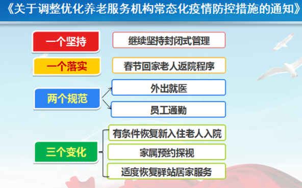 《通知》提出“一个坚持、一个落实、两个规范、三个有条件恢复”七项措施,即养老机构继续坚持封闭式管理;落实春节回家老人返院;规范员工通勤返岗管理、规范外出就医老人返院程序;有条件恢复家属探视、有条件恢复新入住老人入院、有条件恢复驿站开展居家养老服务。