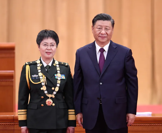 9月8日,全国抗击新冠肺炎疫情表彰大会在北京人民大会堂隆重举行。中共中央总书记、国家主席、中央军委主席习近平向“人民英雄”国家荣誉称号获得者陈薇颁授奖章。新华社记者 申宏 摄