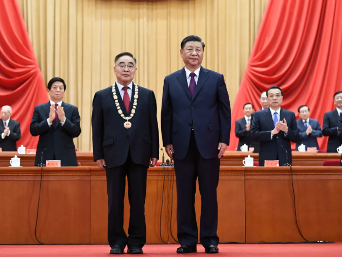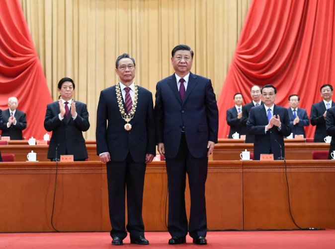 栗战书宣读习近平签署的中华人民共和国主席令。主席令指出,为了隆重表彰在抗击新冠肺炎疫情斗争中作出杰出贡献的功勋模范人物,弘扬他们忠诚、担当、奉献的崇高品质,根据第十三届全国人民代表大会常务委员会第二十一次会议的决定,授予钟南山“共和国勋章”,授予张伯礼、张定宇、陈薇“人民英雄”国家荣誉称号。