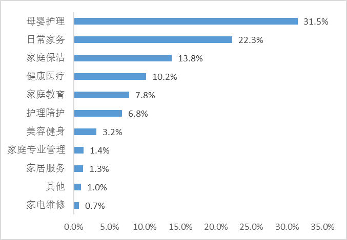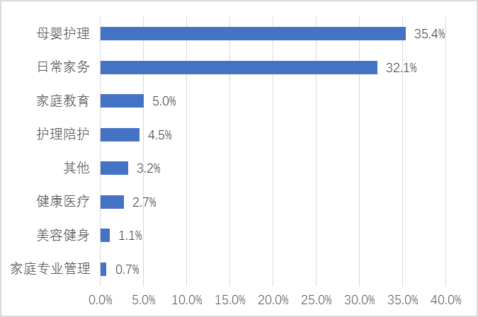 因家政服务种类繁杂细分,目前学界业界还未对家政服务给出明确的内容分类。我们结合目前家政市场现有的实际工种,拟定本报告所探讨的家政服务类别,将其分为家务劳动(做饭、洗衣、日常清洁等)、家庭保洁(专业清洁、家具养护、深度清洁等)、家居服务(搬家、房屋维修、家电安装、送水配送等)、护理陪护(老人陪护、病患护理等)、母婴护理(月嫂、育婴师、催乳师等)、家庭教育(育儿早教、家教辅导等)、健康医疗(营养师、康复理疗、医护上门等)、美容健身(美容师、美甲师、健身教练等)、家庭专业管理(高级管家、家庭理财顾问、家庭消费咨询等)、其他等11个大类。
