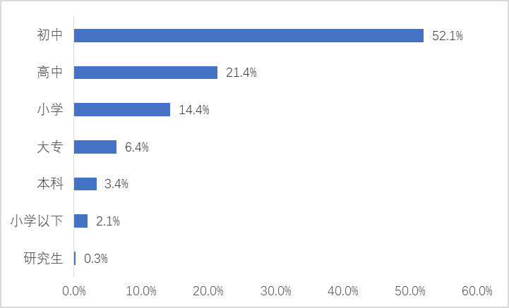 ○ 小学以下○ 小学○ 初中○ 高中/中专/技校