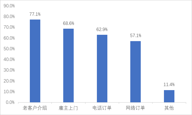 所调查的家政机构类型中,传统门店的比例为30.6%,传统门店和线上订单相结合的机构占27.5%,O2O平台占18.4%。O2O家政平台涌现,家政市场线上线下结合趋主流。